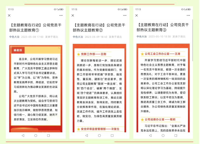 ????及時開辦專題專欄。第一時間開辟“主題教育在行動”專欄,發(fā)布8期共計10篇推文,及時總結(jié)宣傳公司開展主題教育的好做法好經(jīng)驗好成果。結(jié)合公司成立七十周年系列宣傳活動,開辦了“櫛風沐雨70年·青年說”“歷史影像”“我的有色年華”等專欄,引導(dǎo)黨員干部職工結(jié)合企業(yè)發(fā)展史,深刻認識和理解新時代十年的偉大成就,強化理論武裝的思想自覺,提高宣傳引導(dǎo)效果。
